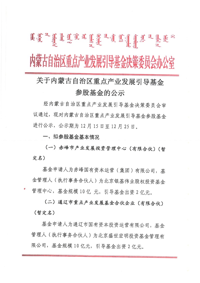 關(guān)于內(nèi)蒙古自治區(qū)重點產(chǎn)業(yè)發(fā)展引導基金參股基金的公示