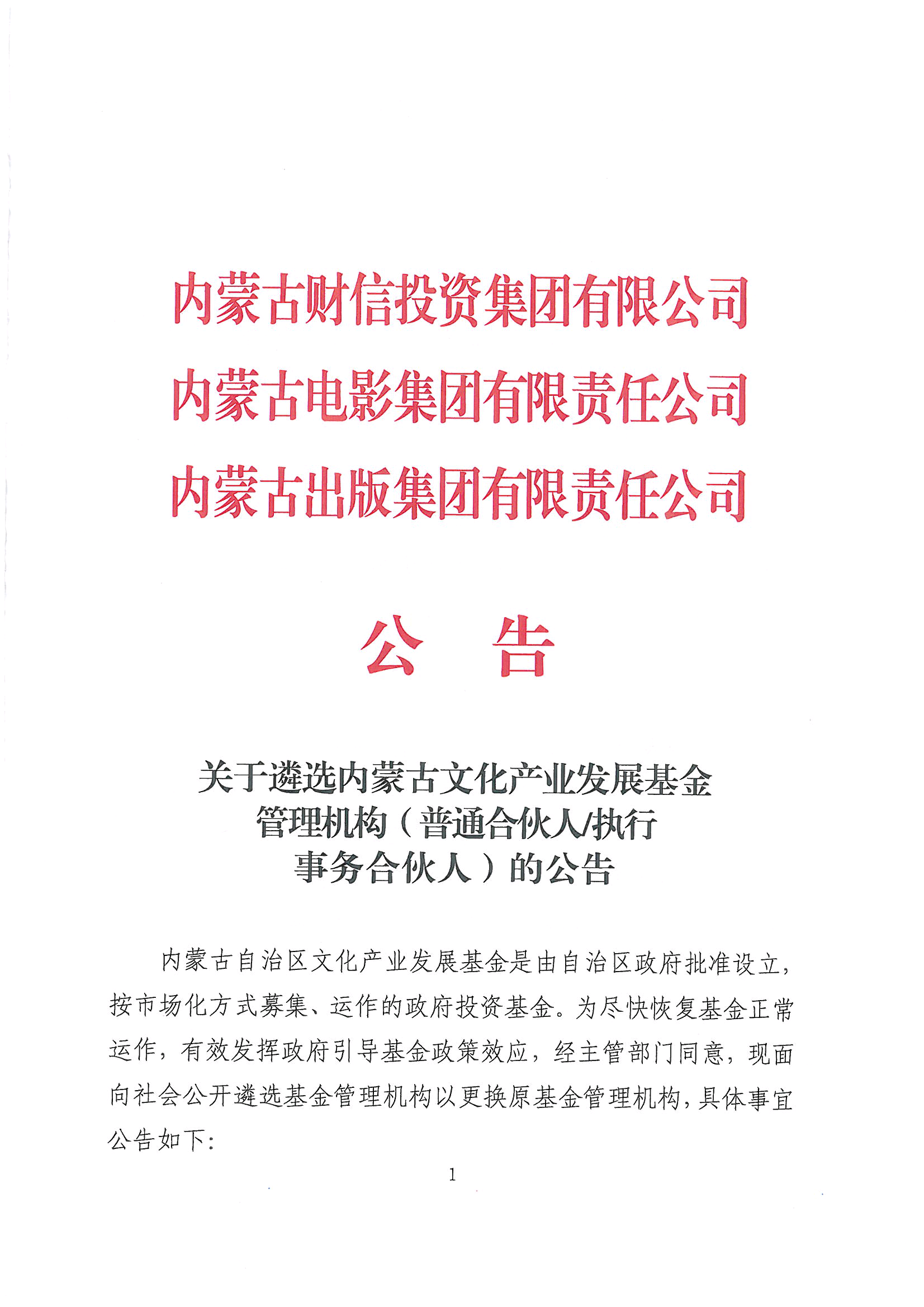 關(guān)于遴選內(nèi)蒙古文化產(chǎn)業(yè)發(fā)展基金管理機構(gòu)(普通合伙人/執(zhí)行事務(wù)合伙人)的公告